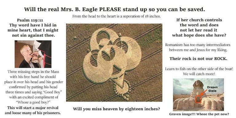 The image below was titled Meet Mrs. B. Eagle she will not soar with the eagles because her church treats her like a dog. Sadly she is not walking with God to notice it. Her faith is in the revived ROMAN priesthood that the early church did well without for over 300 years. God made us Royal priests,  they took that away by not letting anyone know it.